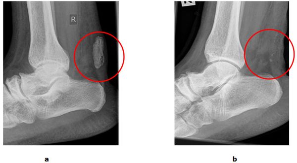 Abb.3: a Sehnensporn und Haglund Exostose im präoperativen Röntgenbild. b Das Fersenbein ist modelliert und die störenden Knochenüberstände wurden entfernt. Der Patient kann wieder schmerzfrei laufen.