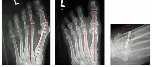 Abb.2: Korrektur einer leichten Hallux valgus Fehlstellung durch eine Chevron Osteotomie (Distale Metatarsale I Osteotomie) mit versenkter Schraube. Der Vorfuß wurde verschmälert und die Knochenachsen begradigt.