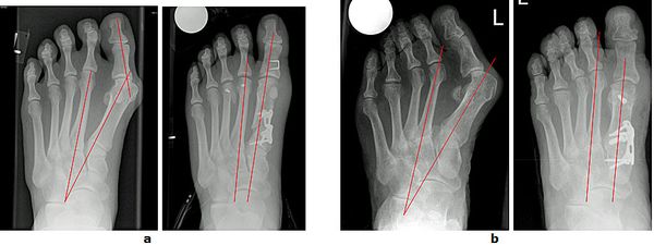 b Die Knochenachsen sind wieder parallel und der Vorfuß verschmälert.