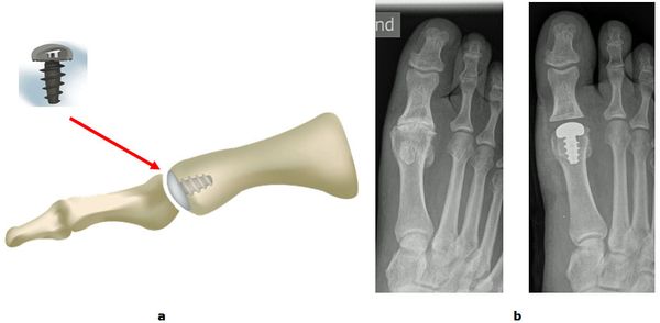 Abb.3: a Korrektur einer mittelschweren Hallux valgus Fehlstellung durch eine Basisosteotomie.